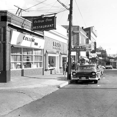 A view of the UVA Corner in the early 1920s shows the Chancellor Building, built in 1914, which held Chancellor’s Drug Store, a billiard parlor and a restaurant, as well as one-room student apartments upstairs, according to Coy Barefoot’s The Corner: A History of Student Life at the University of Virginia. Today, that building houses a Qdoba Mexican restaurant and two clothing stores. Anderson Brothers Bookstore, to the left of the Chancellor Building, operated for 112 years on the Corner, until it was sold to Follet’s, a national college bookstore chain, in 1988. After Follet’s closed in 1997, the building was home to Plan 9 Music and Satellite Ballroom. Since 2008, the building has housed a CVS franchise.